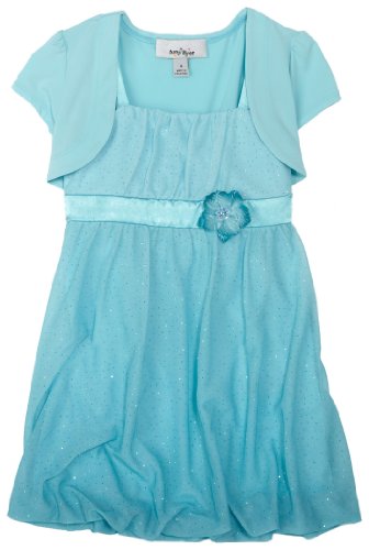Amy Byer Little girls' Great fashion value with Amy Byer splash of color, bolero dress. Shiny satin trim with floral accent. Runway, house of style dress, with light bubbled hemline. The magical look of fashion favorites.